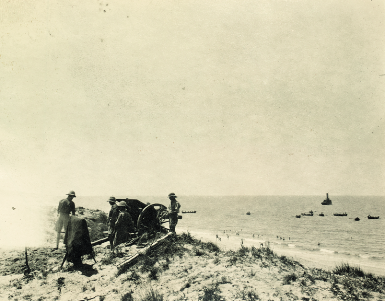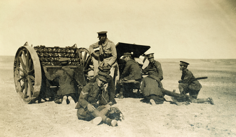 A Battery’s No. 1 Sub-section gun in action, Gulf of Suez, Egypt, 1916; the crew await a telephone order to fire (HAC Archives)
