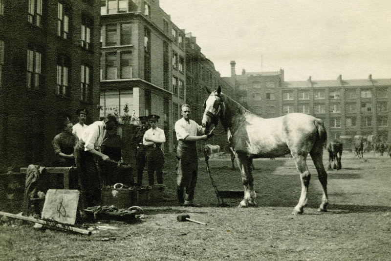 Blacksmiths shoe a transport horse of the 1st Battalion in the Artillery Garden, August 1914 (HAC Archives)