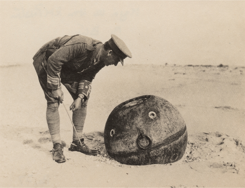 B Battery’s Commanding Officer inspects a mine, possibly El Arish, Egypt, January 1917 (HAC Archives)
