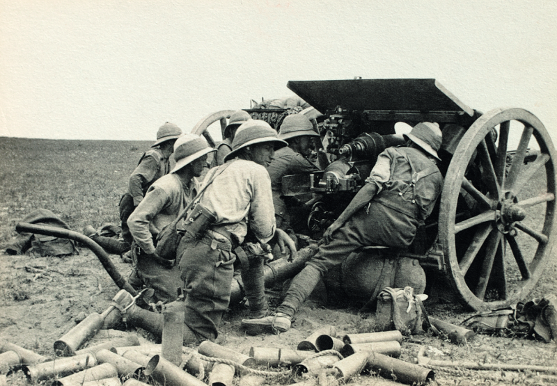 “B” Sub-section of B Battery firing at Munkeileh, Gaza, just before a shell knocks out the men pictured, 19 April 1917 (HAC Archives)