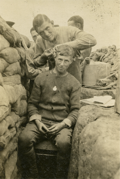 A trench barber, Ypres Salient area, c.spring 1915 (HAC Archives)